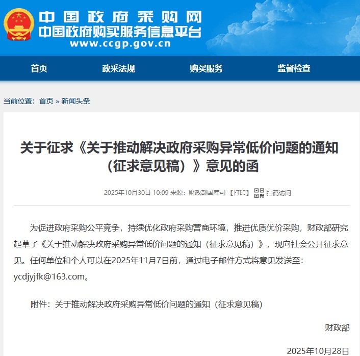 財政部就《關(guān)于推動解決政府采購異常低價問題的通知(征求意見稿)》向社會公開征求意見